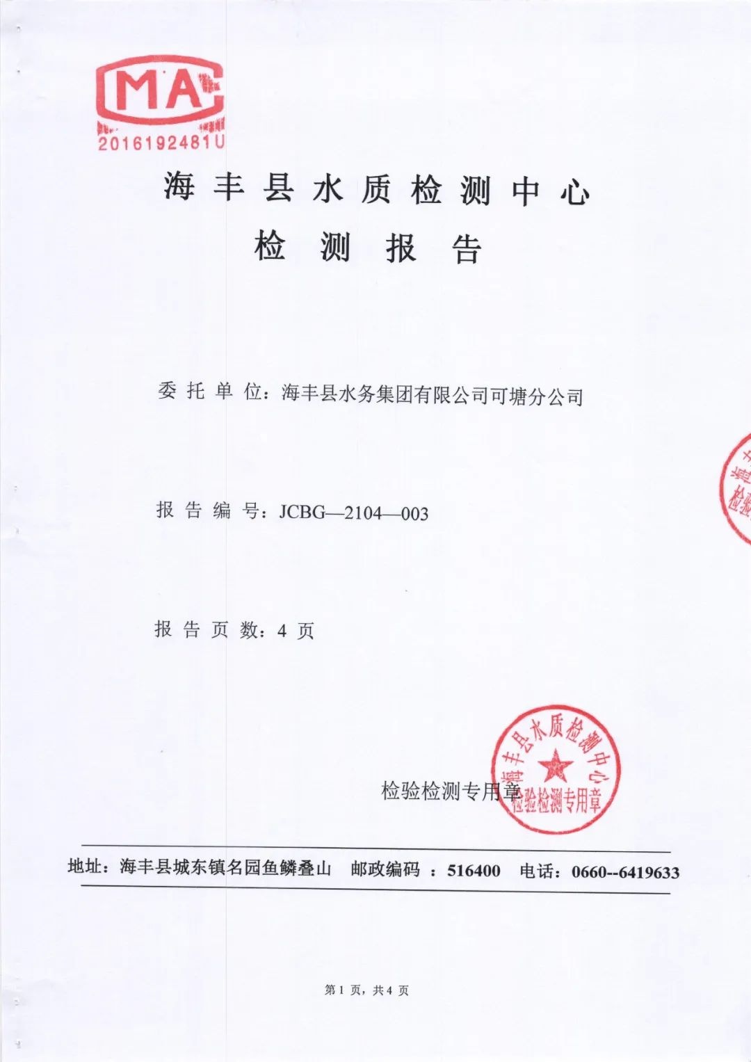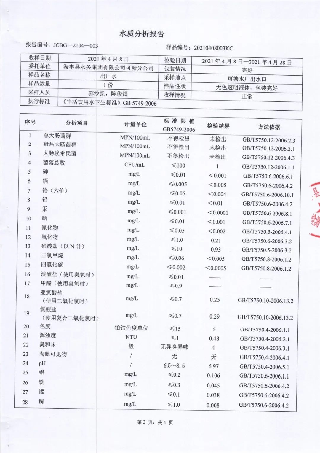 海豐縣自來水公司連續使用歐泰華二氧化氯發生器超過二十年,作為水廠的凈水消毒設備,出廠水的余氯和各項衛生指標完全達到國家標準要求。該發生器運行穩定、操作簡便、安全性能高,售后服務及時,非常適合水廠使用,現在推薦給同行朋友們。水廠水質檢測報告,在未配套殘液分離裝置下,消毒副產物指標氯酸鹽、亞氯酸鹽能達到0.30以下。