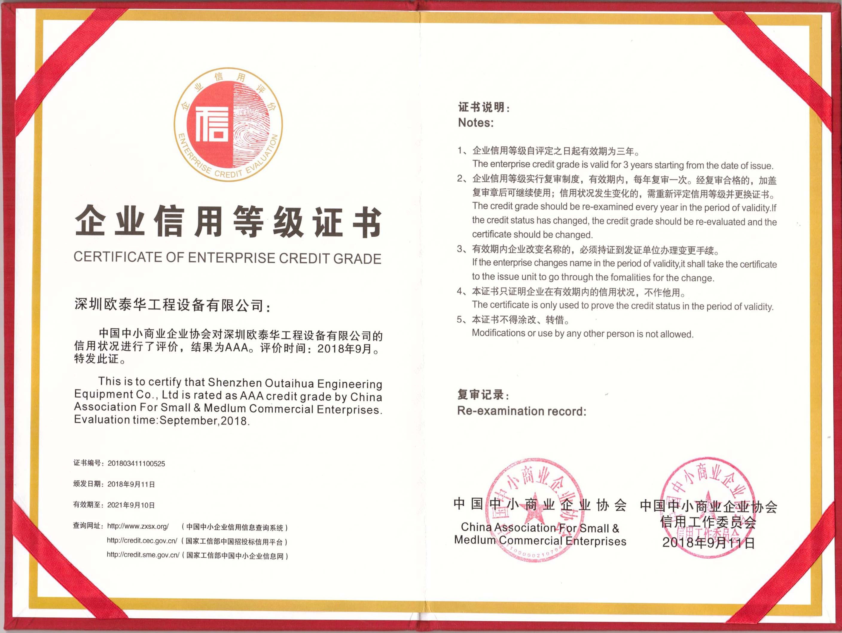 2018年第四季度,中國中小商業企業協會工作委員會公告了《2018年中小企業信用AAA評價結果》,深圳歐泰華工程設備有限公司榜上有名,標志著公司順利通過復審,再次被認定為中小企業信用AAA的企業,現已頒發證書。