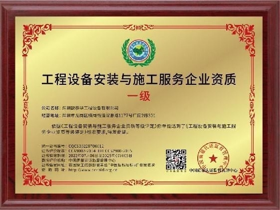 近日,公司迎來特大喜訊,經(jīng)中國質(zhì)量認(rèn)證監(jiān)督管理中心評審后,榮獲“工程設(shè)備安裝與施工服務(wù)企業(yè)”一級資質(zhì)。此項(xiàng)榮譽(yù)是深圳歐泰華在設(shè)備安裝與施工服務(wù)領(lǐng)域的新升級,進(jìn)一步拓寬了業(yè)務(wù)范圍,為公司服務(wù)提供了更大保障。