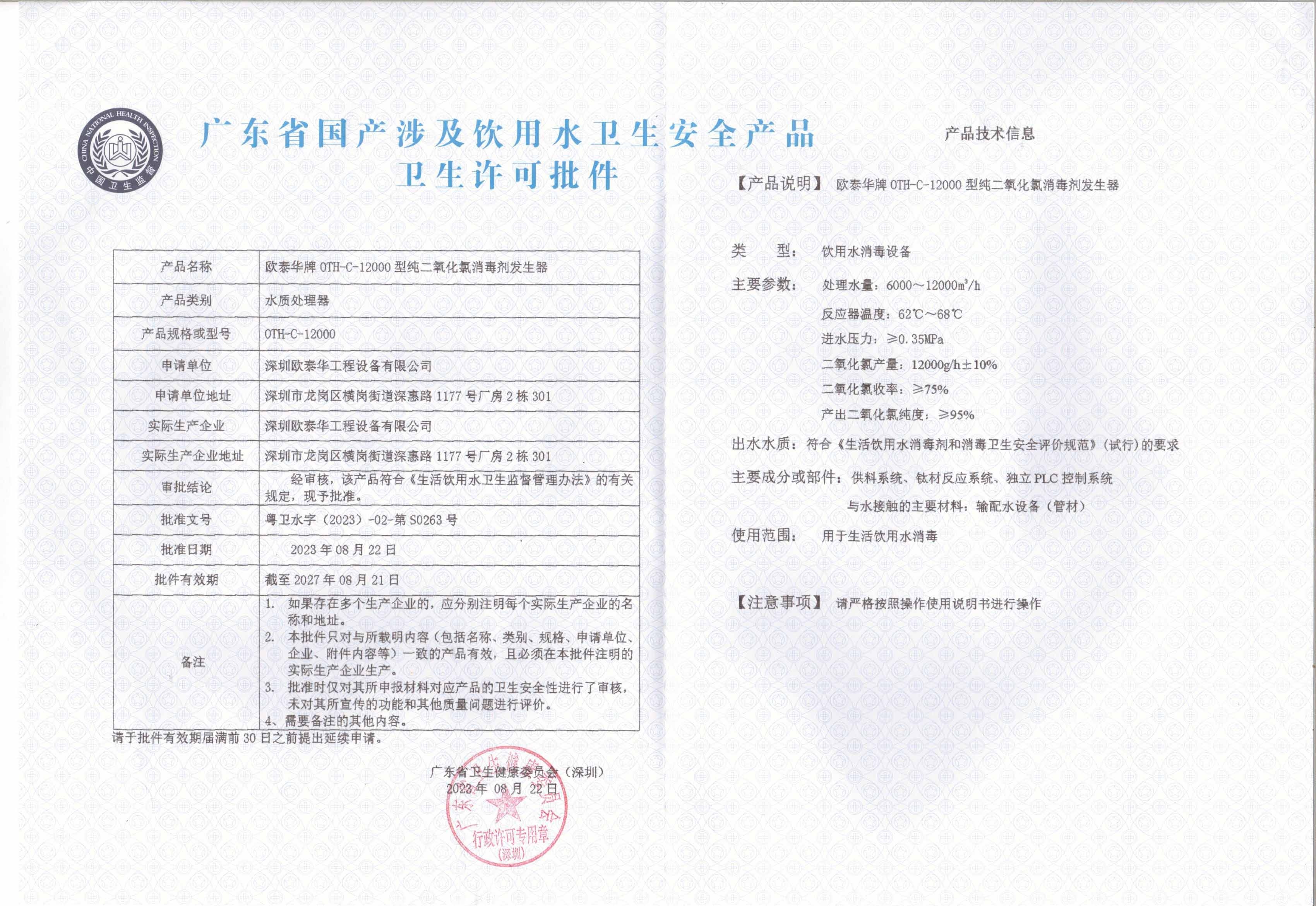 近日,公司申報的“歐泰華牌”OTH-C--12000型純二氧化氯消毒劑發生器順利獲得“廣東省國產涉及飲用水衛生安全產品衛生許可批件”。