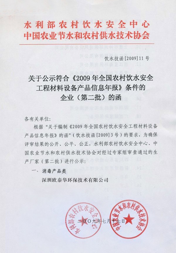 歐泰華二氧化氯發生器光榮入選農村飲水安全產品